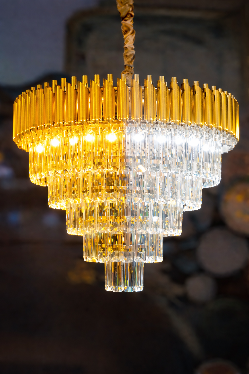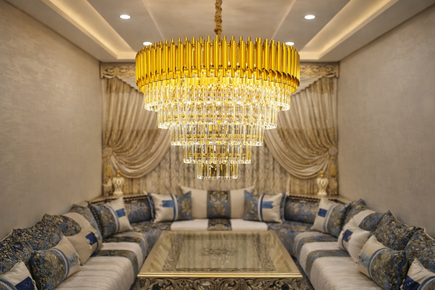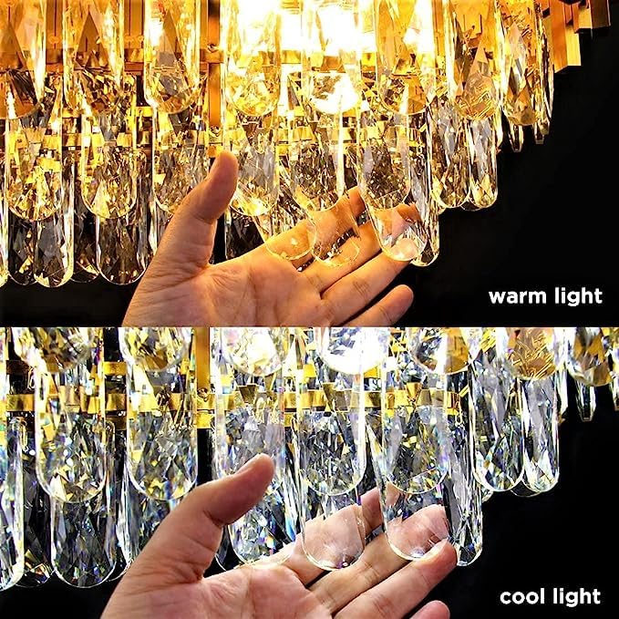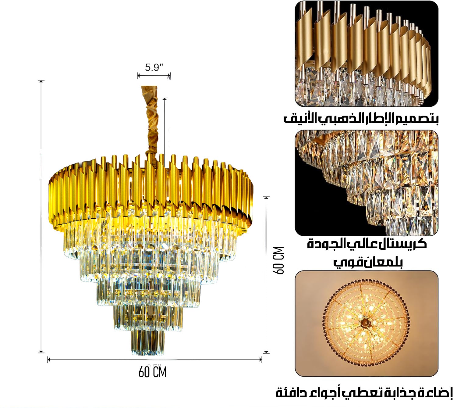 تجمع بين الإطار الذهبي الأنيق وكريستال K9 عالي الجودة، لتعطي إضاءة قوية ولمعان استثنائي يغيّر أجواء الصالون أو غرفة المعيشة بالكامل